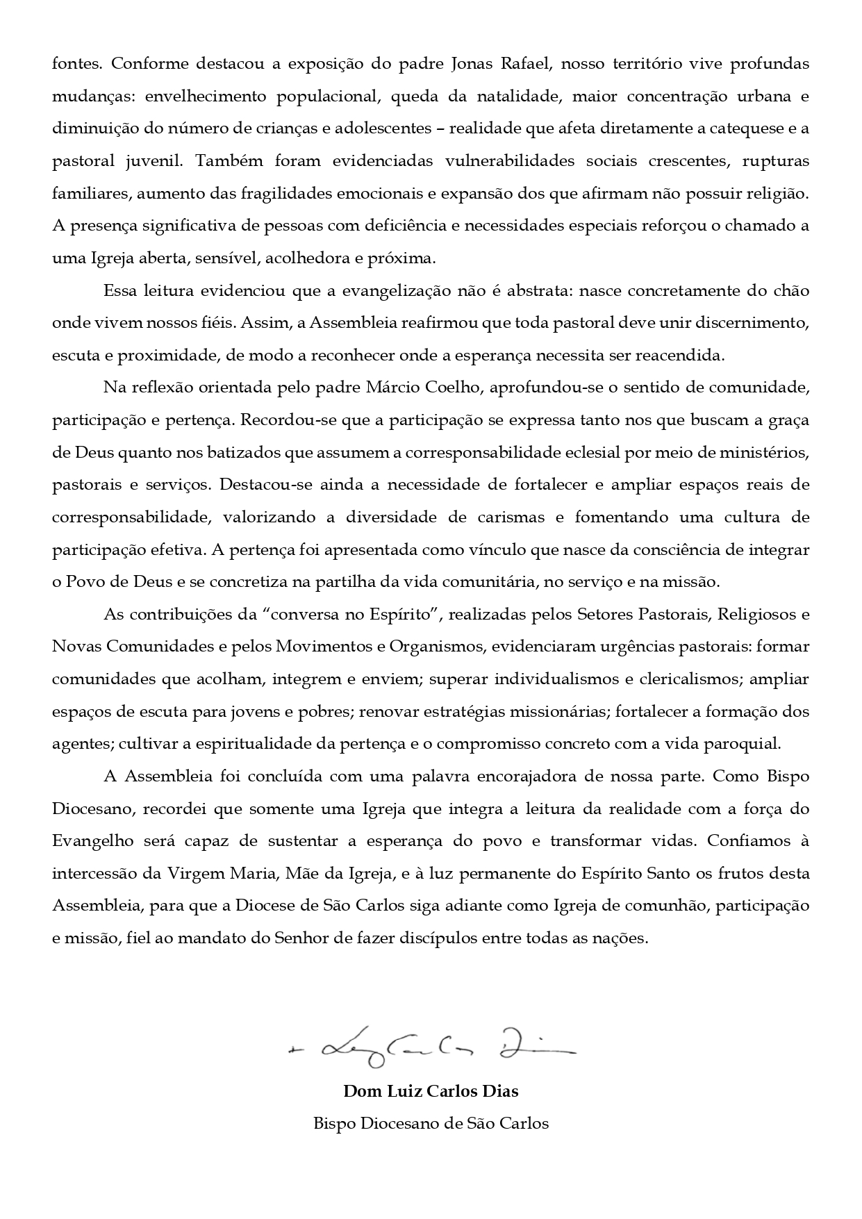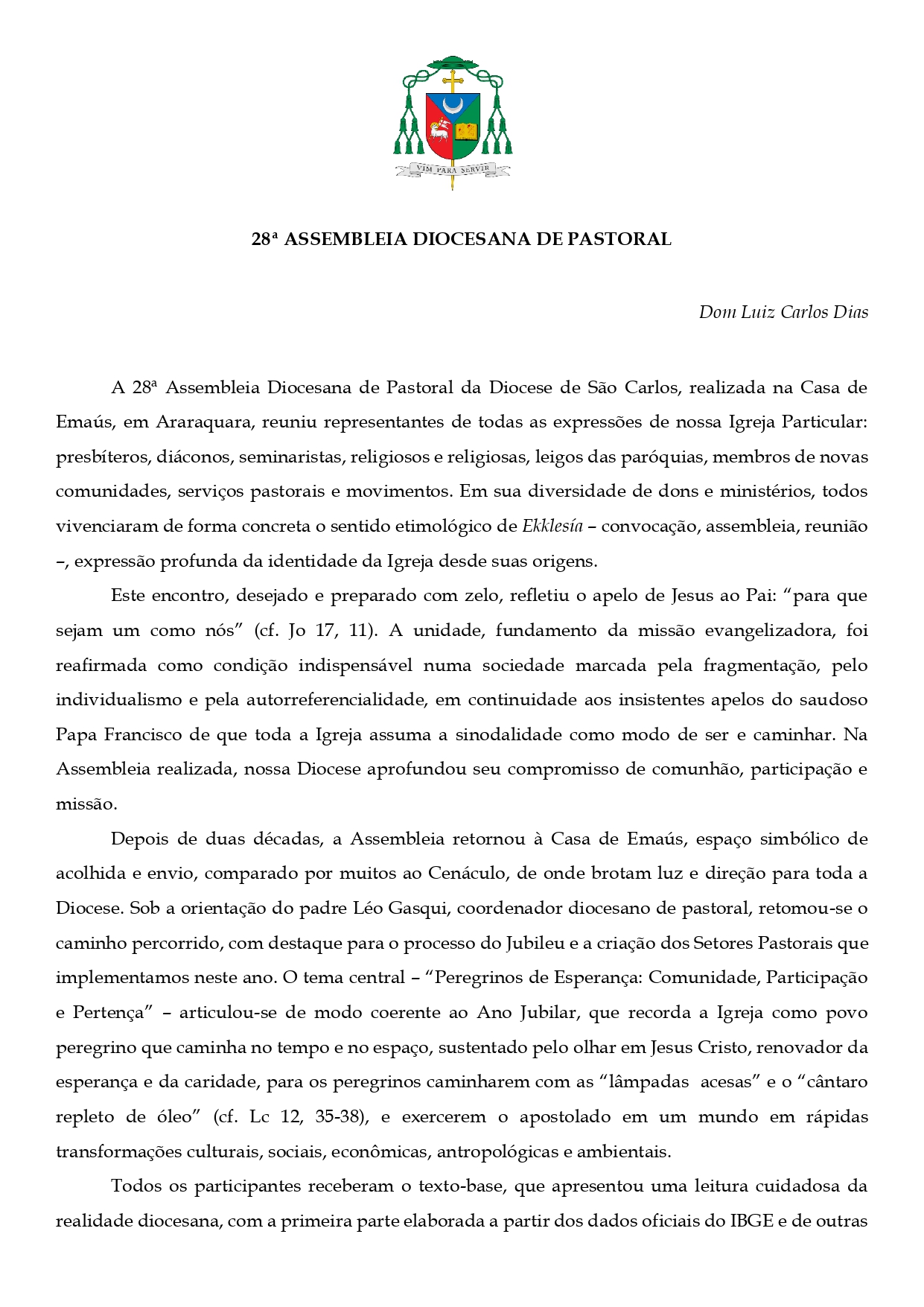 28ª Assembleia Diocesana de Pastoral – Artigo de Dom Luiz Carlos Dias
