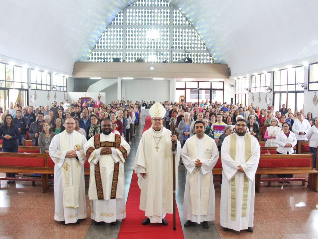 A missa das 15h foi presidida por Dom Luiz Carlos. Estavam presentes, também, na celebração, o pároco da comunidade Pe. Willian, Frei Rafael que é Franciscano Conventual e filho da Paróquia, Pe. Tiago Palialogo, pároco e reitor do Santuário Nossa Senhora Aparecida e o diácono Bruno, diácono transitório que trabalha na Paróquia Santo Antônio.