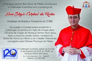 Dom Sérgio da Rocha, arcebispo metropolitano de Brasília e presidente da Conferência Nacional dos Bispos do Brasil (CNBB), estará presente nesta sexta- feira (16) na cidade Matão/SP. Na ocasião, o cardeal estará presidindo a Celebração em Ação de Graças pelos 120 anos de criação da Paróquia Senhor Bom Jesus, inserida no Vicariato Senhor Bom Jesus.