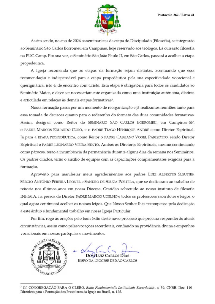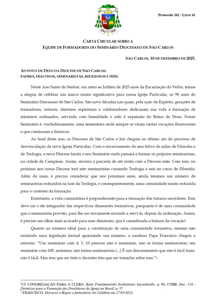 Carta circular sobre a Equipe de formadores do Seminário Diocesano