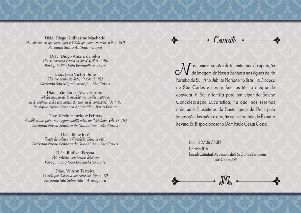 A Diocese de São Carlos, está em festa. Neste sábado, 22 de abril, às dez horas da manhã, na Catedral São Carlos Borromeu , pela imposição das mãos e oração consecratória de Dom Paulo Cezar, o nosso Bispo Diocesano, será ordenado presbítero, os Diáconos Diego Guilherme Machado, Diogo Amaro da Silva, João Victor Bulle, João Eudes Alves Ferreira, Kécio Henrique Feitosa, Rene José, Rudival Pessoa e Wilson Teixeira.