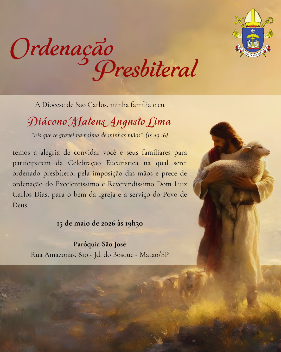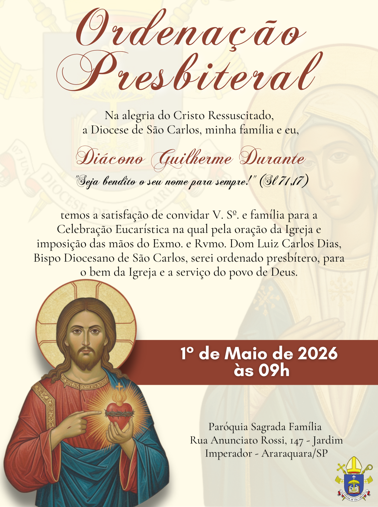 As ordenações serão no mês de maio: O diácono Guilherme será ordenado no dia 1º e o diácono Mateus no dia 15.