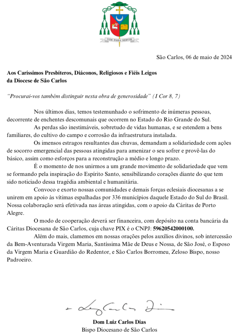 A campanha em nossa diocese continua. A ajuda aos irmãos do Rio Grande do Sul deverá ser enviada via pix para a Cáritas Diocesana de São Carlos, através da chave (CNPJ): 59620542000100.