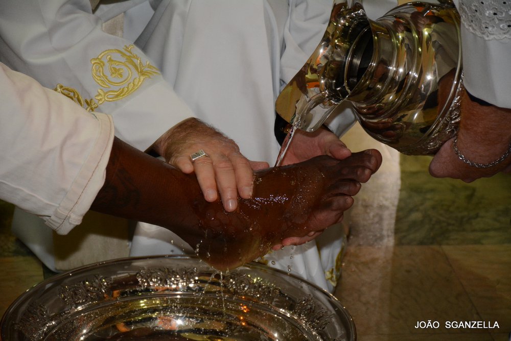 Após a homilia, teve início o Rito de Lava-pés. Imitando o gesto de Jesus, o Bispo Diocesano lavou os pés dos homens, da Comunidade Divina Misericórdia, ressaltando a missionariedade e os diversos trabalhos sociais realizados na Diocese, em especial, com os irmãos em situação de rua.