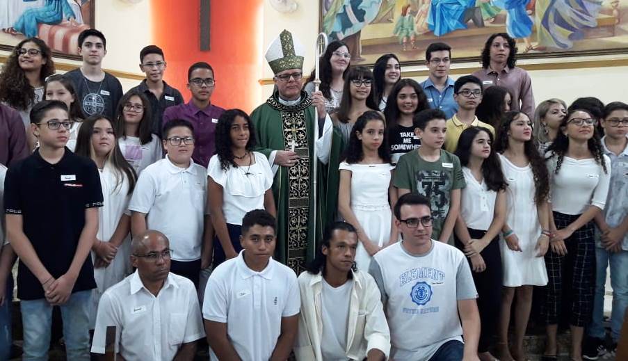 No último domingo (10) a paróquia Nossa Senhora do Carmo alegrou-se com a presença de nosso bispo diocesano Dom Paulo Cezar, que na ocasião celebrou a Santa Missa e conferiu o sacramento do Crisma a 39 jovens e adultos.