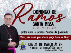 A nossa Diocese de São Carlos, em comunhão com Papa Francisco e a Comissão Episcopal Pastoral para a Juventude da CNBB, convida toda Juventude Diocesana para estar conosco no próximo domingo (25) na cidade de São Carlos, às 09h da manhã, em frente ao Colégio São Carlos, onde sairemos em procissão com o nosso bispo até a Catedral, celebrando a Jornada Mundial da Juventude em nossa diocese.