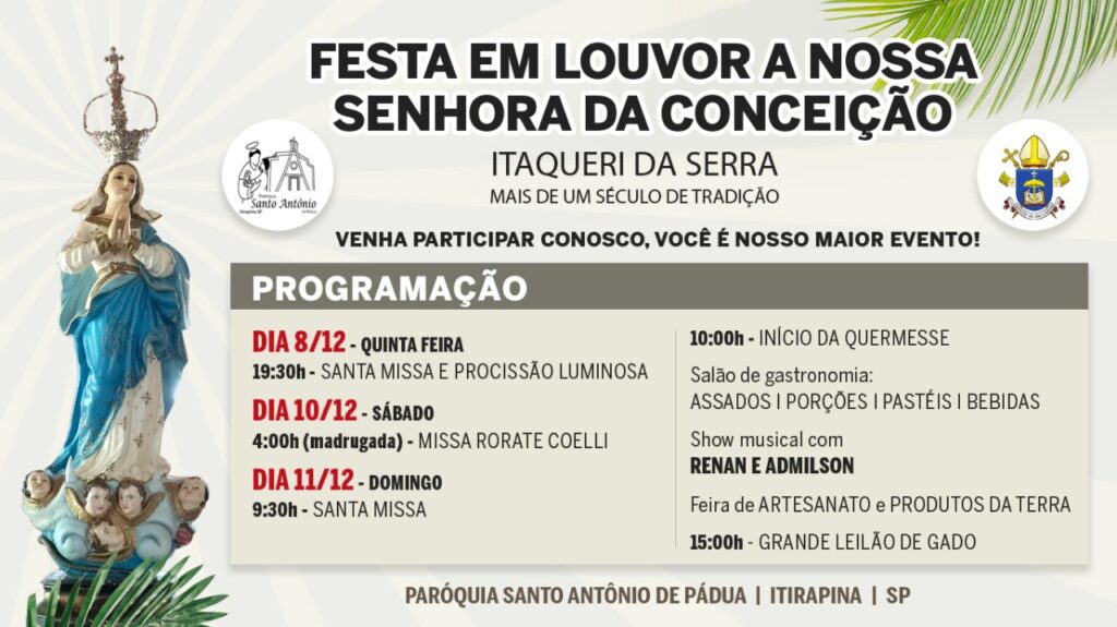 A festa em louvor a Nossa Senhora da Conceição, uma tradição de mais um século no Distrito de Itaqueri da Serra, vai acontecer nos dias 8 e 11 de dezembro, com programação religiosa – missas e procissão e atrações diversas, entre elas quermesse, show musical, gastronomia, feira de artesanato e leilão de gado.