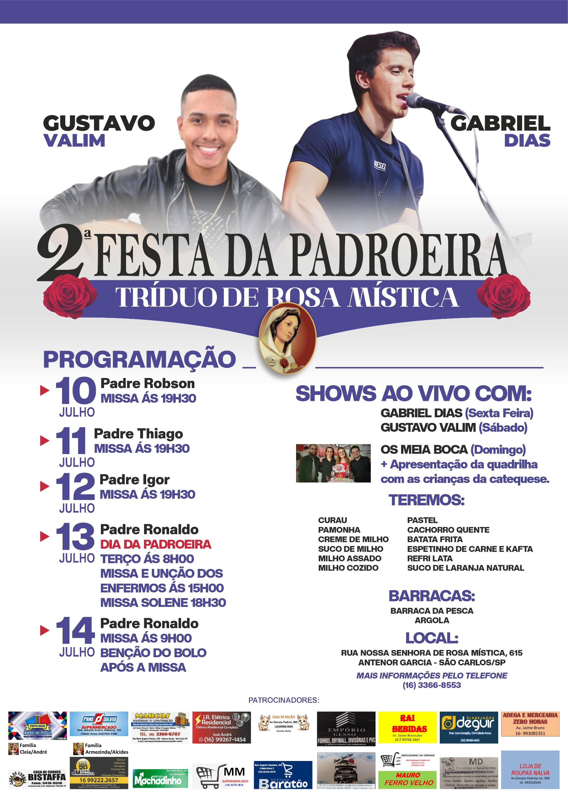 Haverá quermesse nos dias 12, 13 e 14, com shows ao vivo, quadrilha e muitas comidas típicas.
