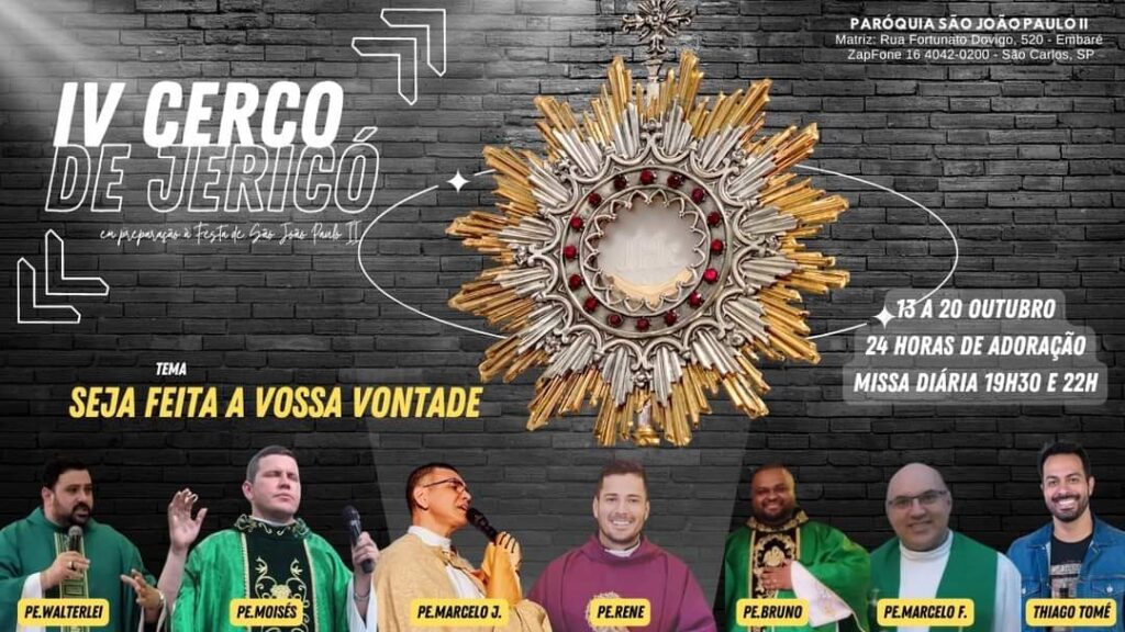 Começa neste domingo (13) o grande Cerco de Jericó em sua quarta temporada. O missionário Thiago Tomé da comunidade Canção Nova estará em São Carlos fazendo a abertura deste momento a partir das 15h com a Santa Missa, pregação e muito louvor. Durante 7 dias haverá adoração ao Santíssimo Sacramento, 24 horas por dias, contanto com duas Missas diárias: às 19h30, que contará com a presença de diversos sacerdotes, e outra às 22h.