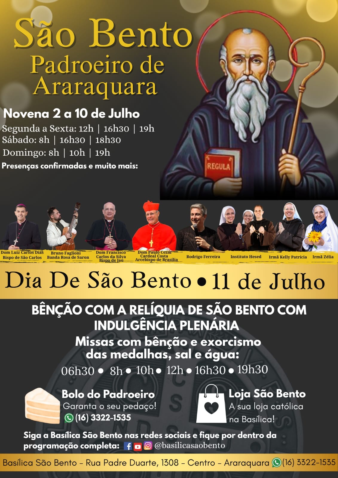 No próximo dia 11 de julho é celebrado o dia de São Bento de Núrsia. O santo é padroeiro da Europa, da cidade de Araraquara e invocado como protetor contra o mal e forças negativas.