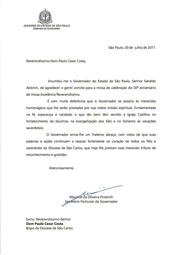 Governador do Estado de São Paulo, Geraldo Alckmin envia votos de felicitações para Dom Paulo