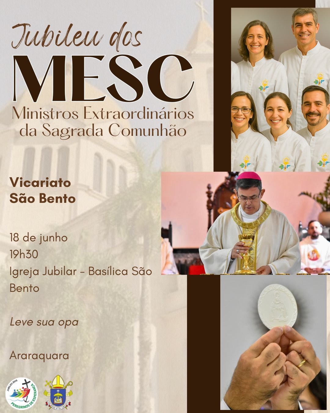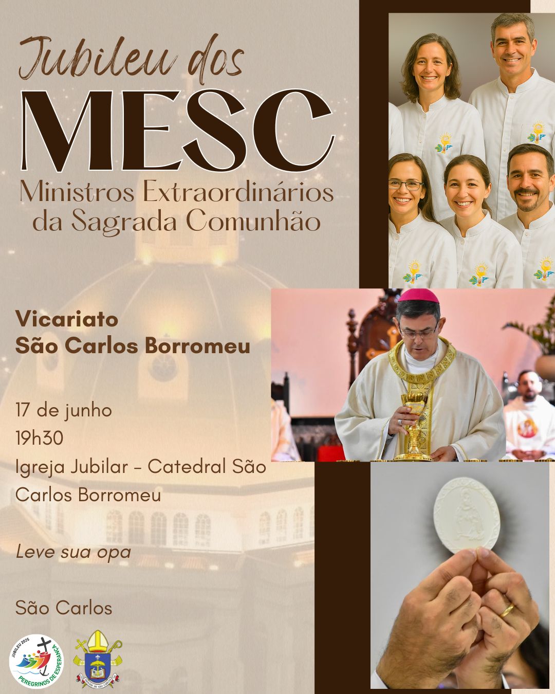 Nos dias 16, 17 e 18 de junho acontecerá a Celebração do Jubileu dos MESC – Ministros Extraordinários da Sagrada Comunhão, nos três vicariatos: São Carlos, São Bento e Senhor Bom Jesus, às 19h30.