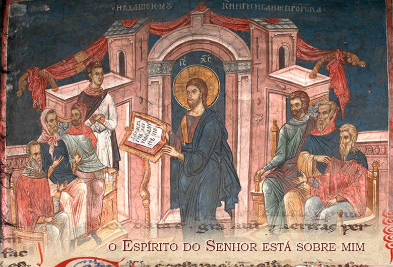 Naquele tempo, veio Jesus à cidade de Nazaré, onde se tinha criado. Conforme seu costume, entrou na sinagoga no sábado, e levantou-se para fazer a leitura. Deram-lhe o livro do profeta Isaías. Abrindo o livro, Jesus achou a passagem em que está escrito: “O Espírito do Senhor está sobre mim, porque ele me consagrou com a unção para anunciar a Boa Nova aos pobres; enviou-me para proclamar a libertação aos cativos e aos cegos a recuperação da vista; para libertar os oprimidos e para proclamar um ano da graça do Senhor”.