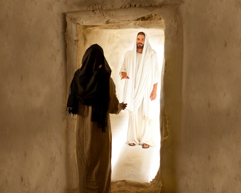 Naquele tempo, as mulheres partiram depressa do sepulcro. Estavam com medo, mas correram com grande alegria, para dar a notícia aos discípulos. De repente, Jesus foi ao encontro delas, e disse: “Alegrai-vos!” As mulheres aproximaram-se, e prostraram-se diante de Jesus, abraçando seus pés.