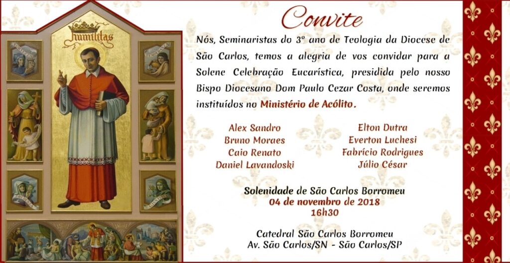 É com grande alegria que os seminaristas, Alex Sandro, Bruno Moraes, Caio Renato, Daniel Lavandoski, Elton Dutra, Everton Luchesi, Fabrício Rodrigues e Júlio César, convidam todos os diocesanos inseridos nos quatros Vicariatos que compõe a Diocese de São Carlos, para participar da Santa Missa em louvor à São Carlos Borromeu, que será presidida por nosso Bispo Diocesano Dom Paulo Cezar Costa, no dia 04/11 (Domingo), à partir das 16h30, na Catedral, na qual serão  instituídos no Ministério de Acólito.