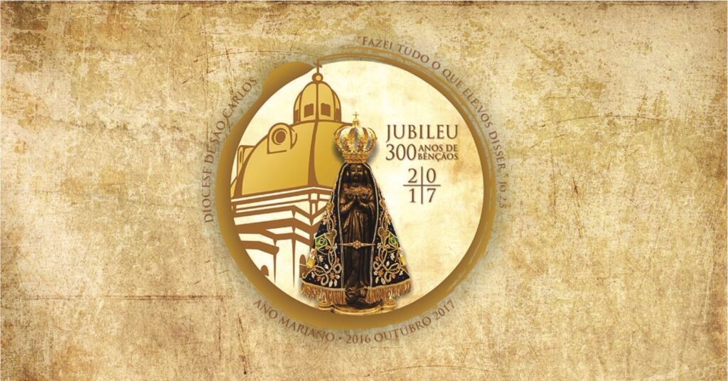 Senhora Aparecida, Mãe Padroeira, em vossa singela imagem, há 300 anos aparecestes nas redes dos três benditos pescadores no Rio Paraíba do Sul. Como sinal vindo do céu, em vossa cor, vós nos dizeis que para o Pai não existem escravos, apenas filhos muito amados. Diante de vós, embaixadora de Deus, rompem-se as correntes da escravidão! Assim, daquelas redes, passastes para o coração e a vida de milhões de outros filhos e filhas vossos. Para todos tendes sido bênção: peixes em abundância, famílias recuperadas, saúde alcançada, corações reconciliados, vida cristã reassumida. Nós vos agradecemos tanto carinho, tanto cuidado! Hoje, em vosso Santuário e em vossa visita peregrina, nós vos acolhemos como mãe, e de vossas mãos recebemos o fruto de vossa missão entre nós: o vosso Filho Jesus, nosso Salvador. Recordai-nos o poder, a força das mãos postas em prece! Ensinai-nos a viver vosso jubileu com gratidão e fidelidade! Fazei de nós vossos filhos e filhas, irmãos e irmãs de nosso Irmão Primogênito, Jesus Cristo, Amém!