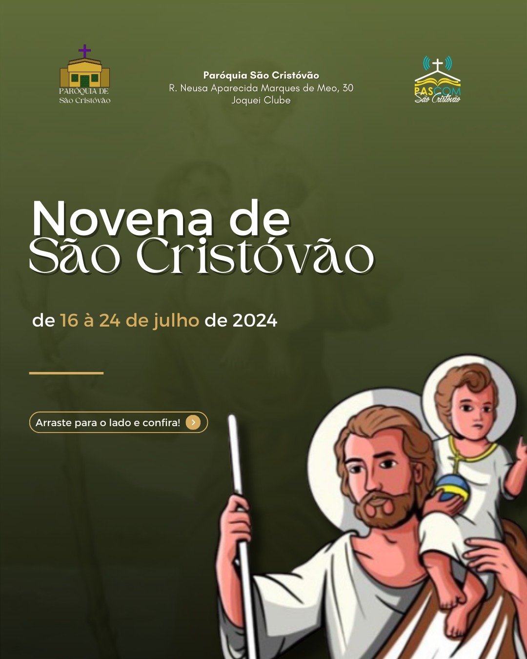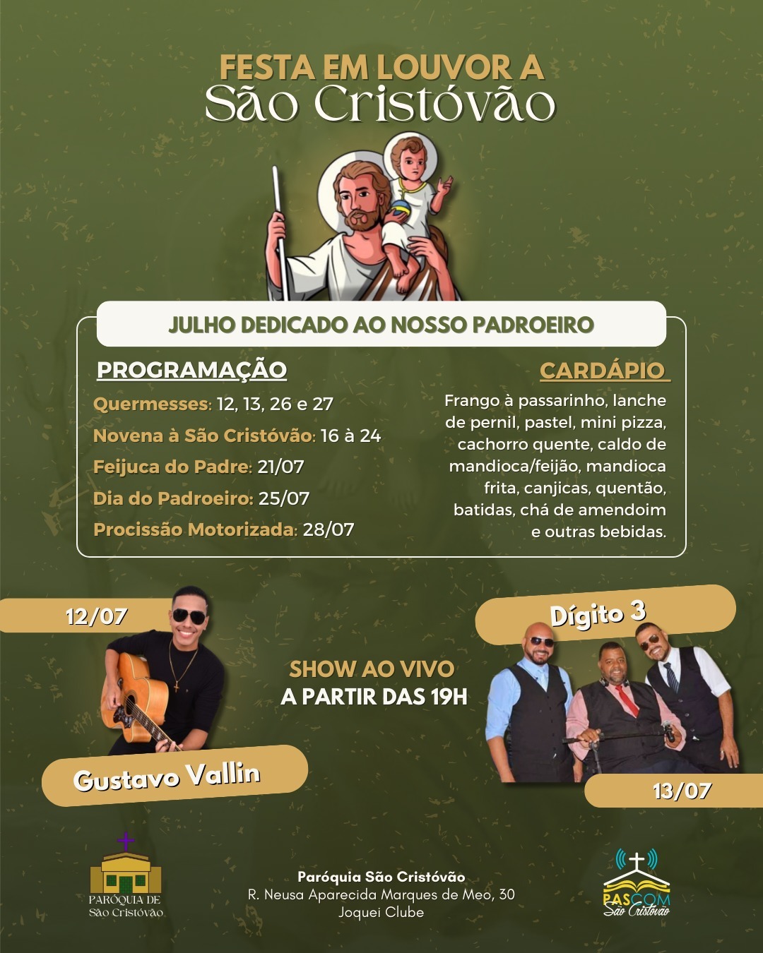 A Paróquia São Cristóvão em São Carlos iniciou a festa do padroeiro. Com programação festiva e religiosa, haverá novena com benção dos objetos, quermesse, a “Feijuca do Padre” e a carreata em honra a São Cristóvão.