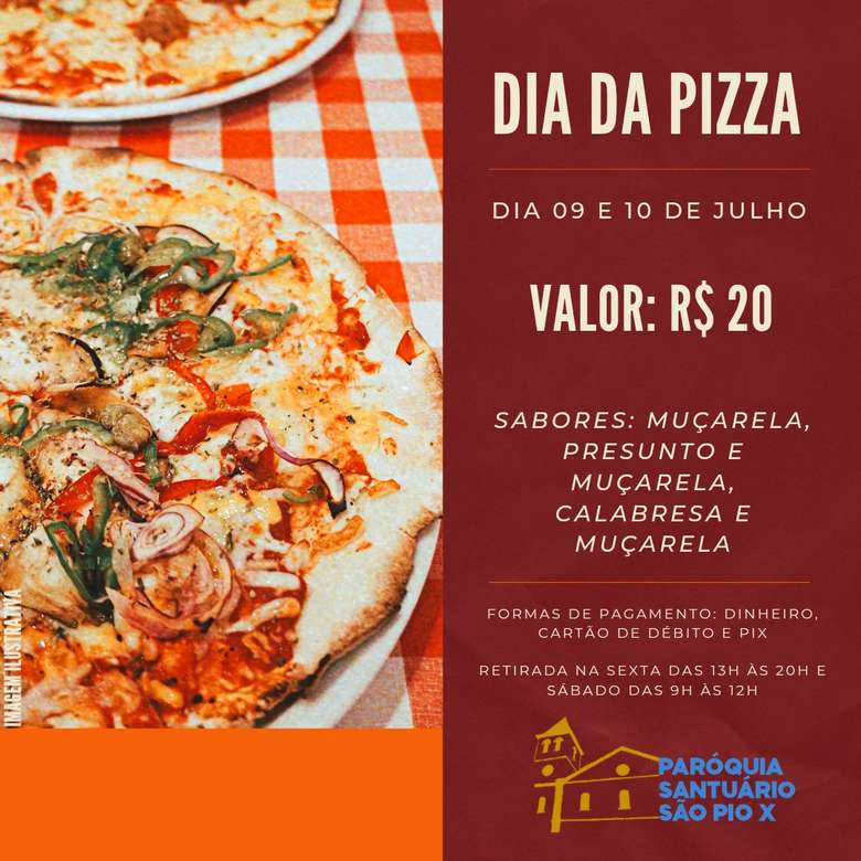 A Paróquia Santuário São Pio X de São Carlos realizará nesta sexta-feira e sábado (9 e 10), o Dia da Pizza. Já tradicional na cidade, a paróquia servirá as pizzas nos sabores mussarela, presunto com mussarela e calabresa com mussarela, no valor de R$ 20,00 a unidade. O evento será realizado em prol da paróquia e acontecerá no sistema drive thru.