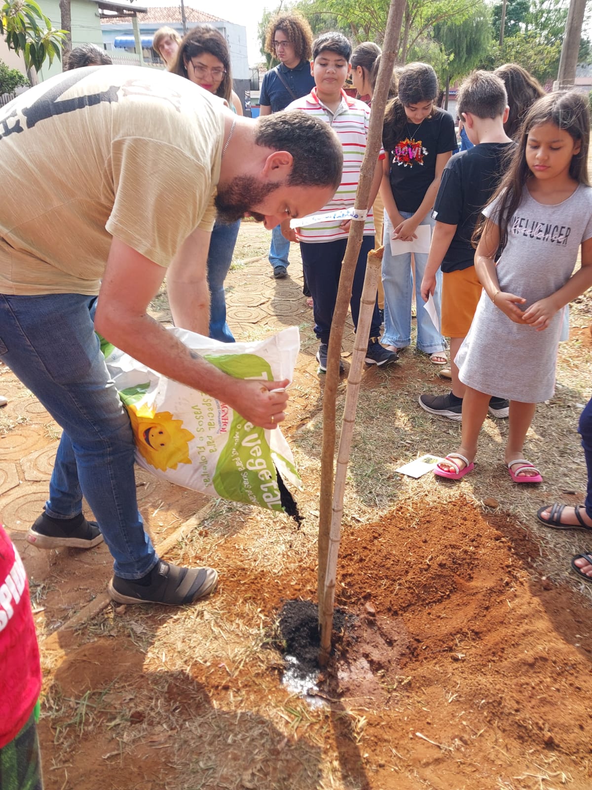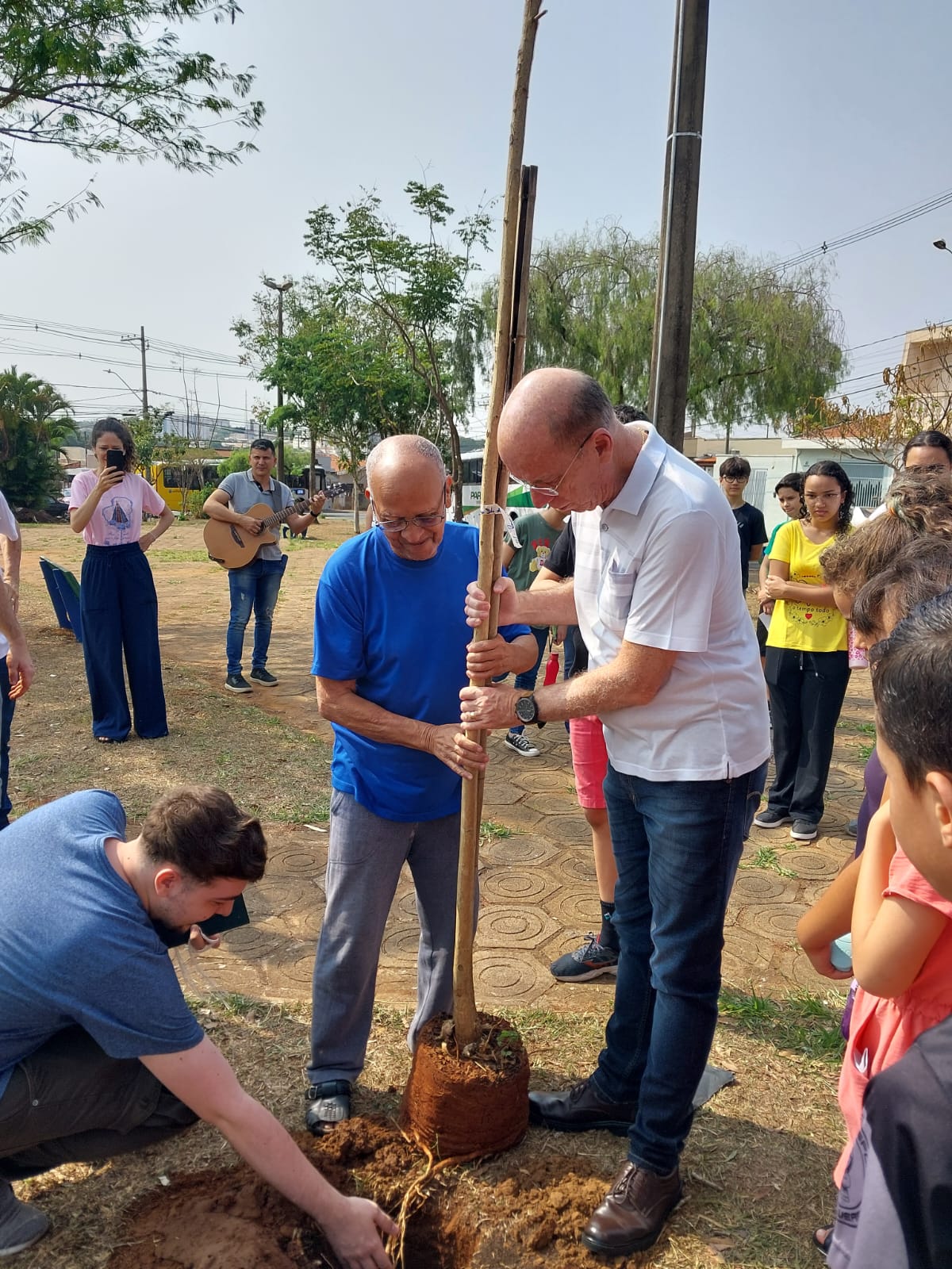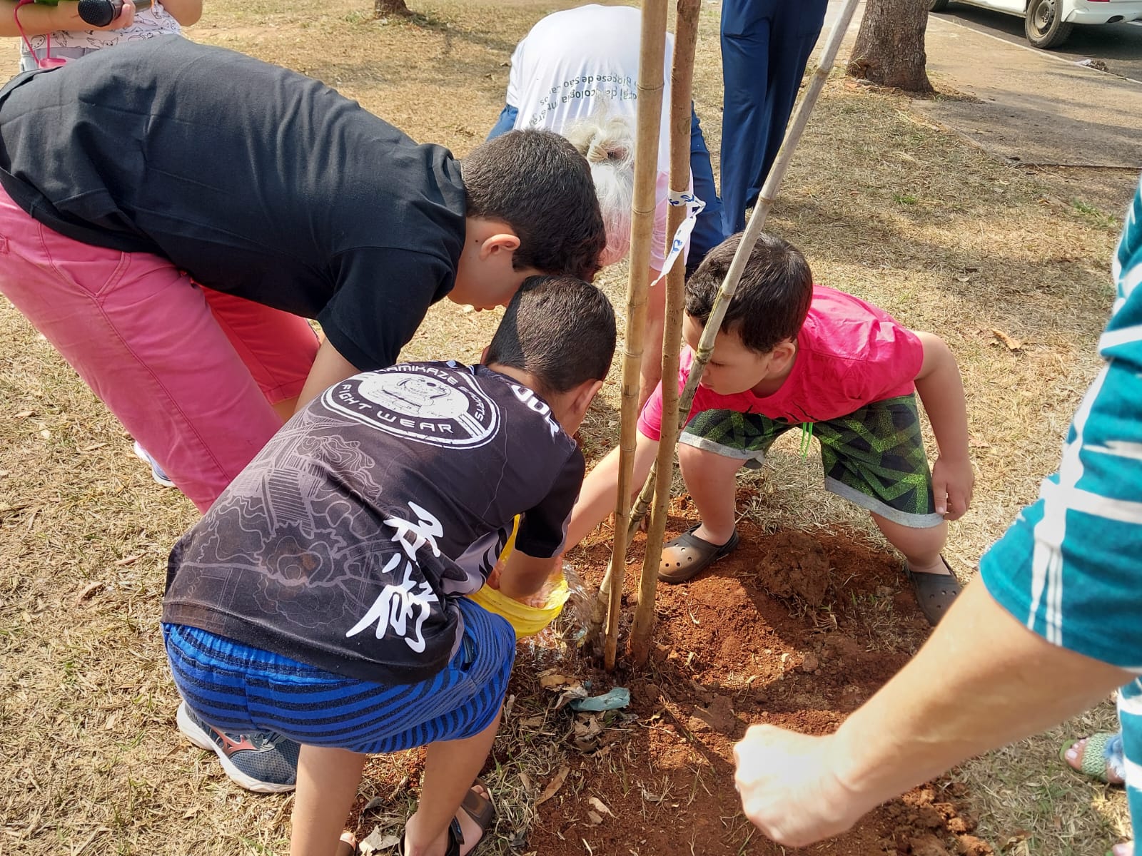 Foram plantadas seis árvores de grande porte, que proporcionarão sombra, abrigo e alimento para os pássaros, ar mais puro e, claro, toda a beleza da natureza.