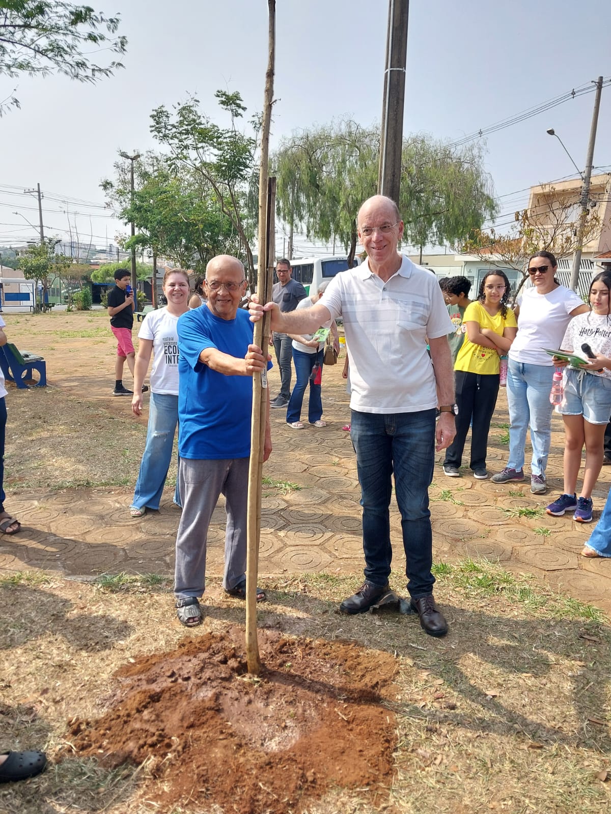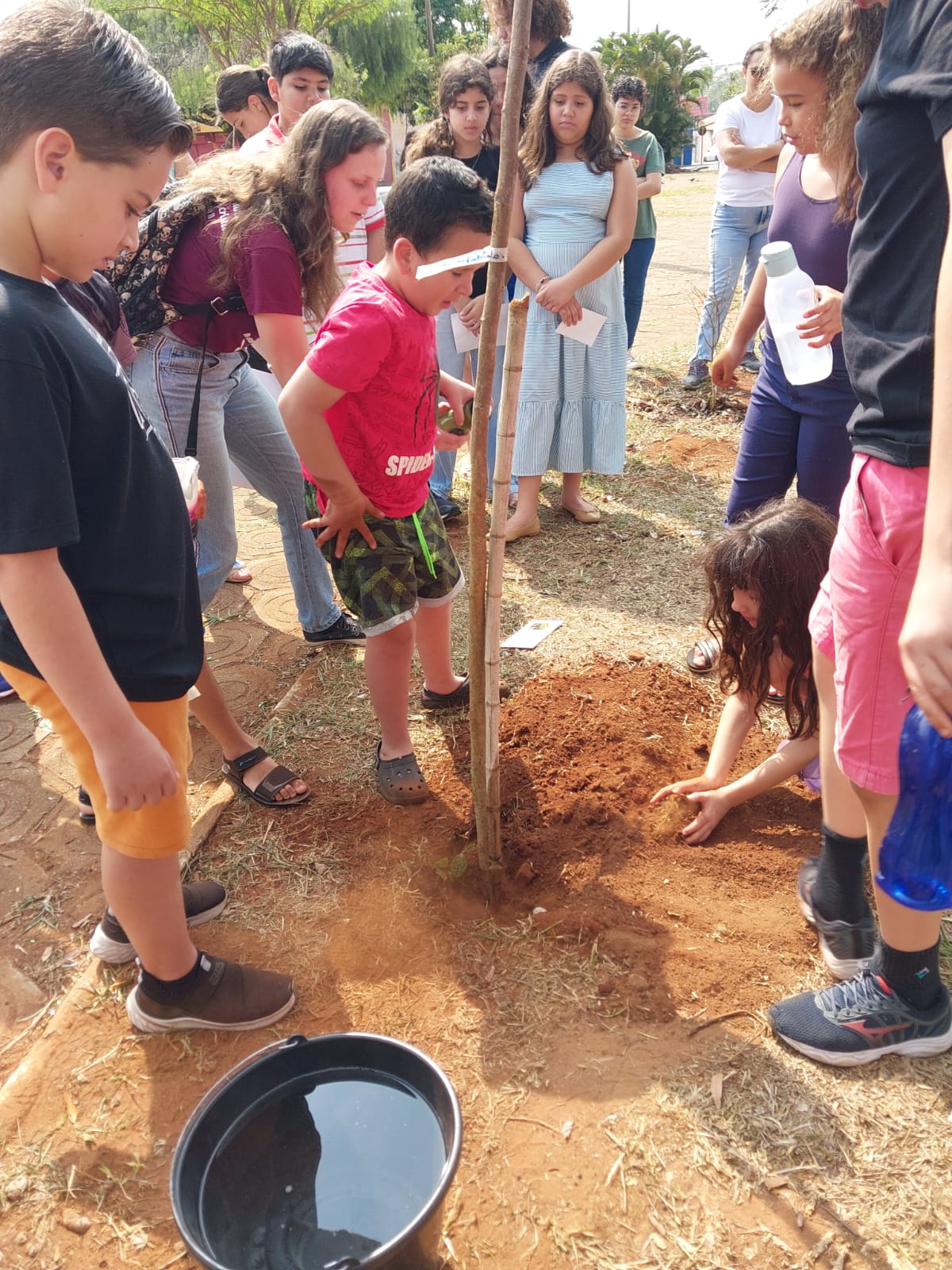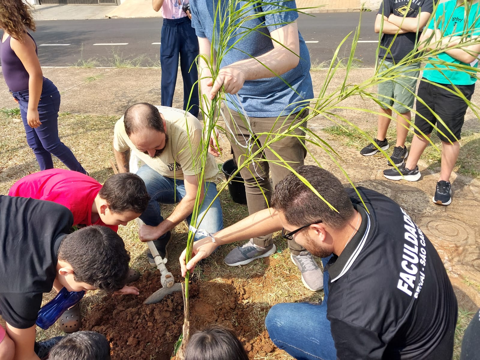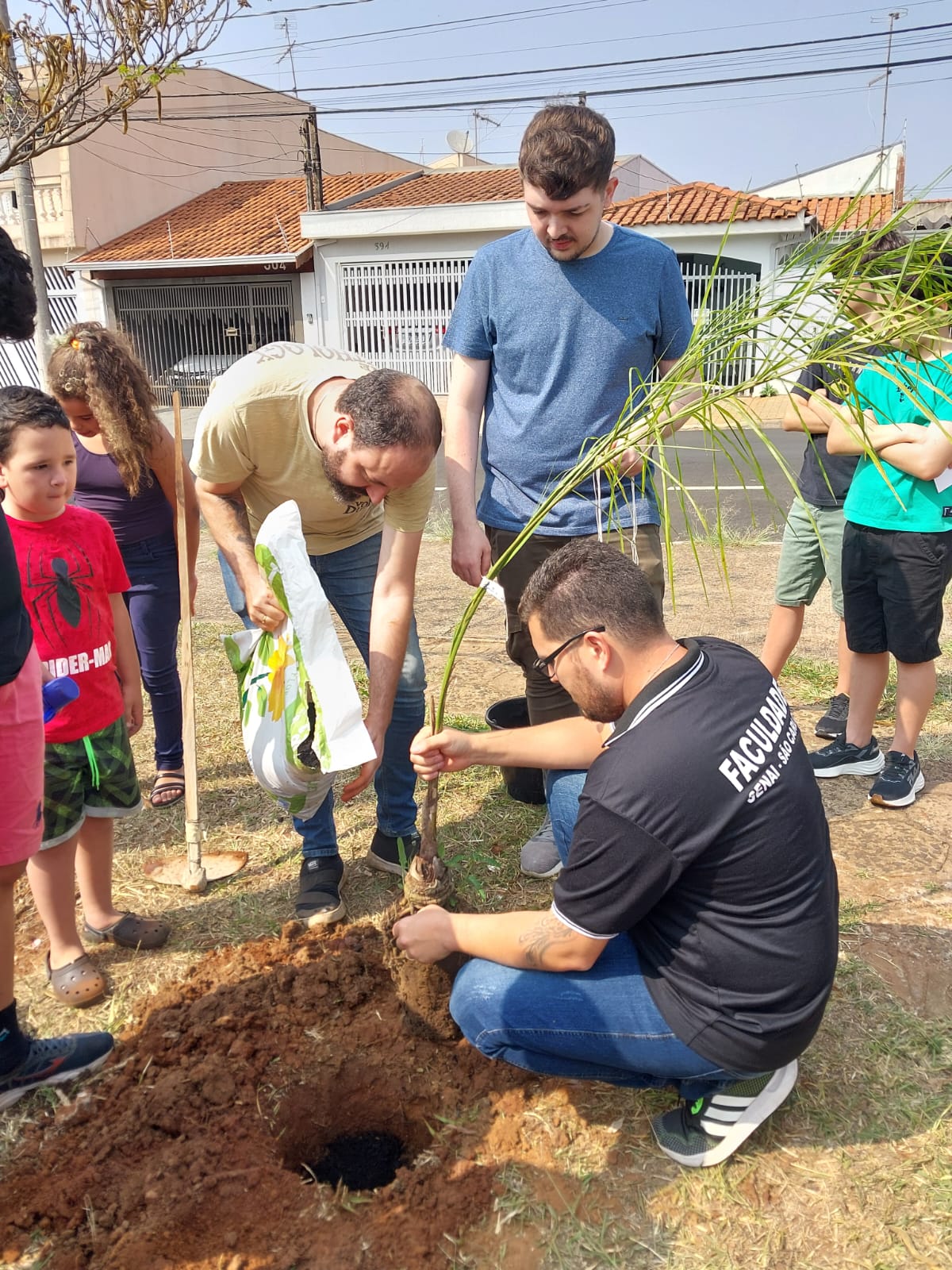 Foram plantadas seis árvores de grande porte, que proporcionarão sombra, abrigo e alimento para os pássaros, ar mais puro e, claro, toda a beleza da natureza.
