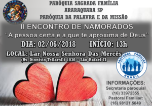A Pastoral Familiar da paróquia Sagrada Família – Araraquara, está preparando um encontro para os namorados com muito carinho e unção. A família começa a se formar no namoro. Convide sua namorada, seu namorado e venha participar conosco!