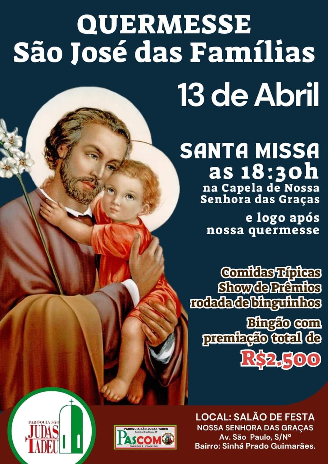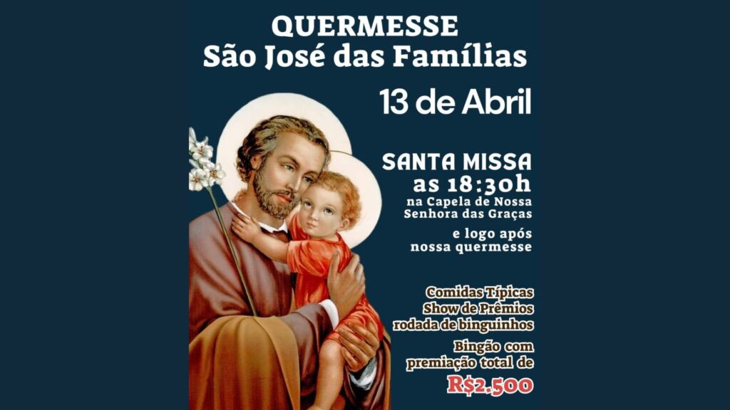 A quermesse será no bairro Sinhá Prado, na Capela de Nossa Senhora das Graças, logo após a Santa Missa das 18h30. Haverá comidas típicas e show de prêmios.