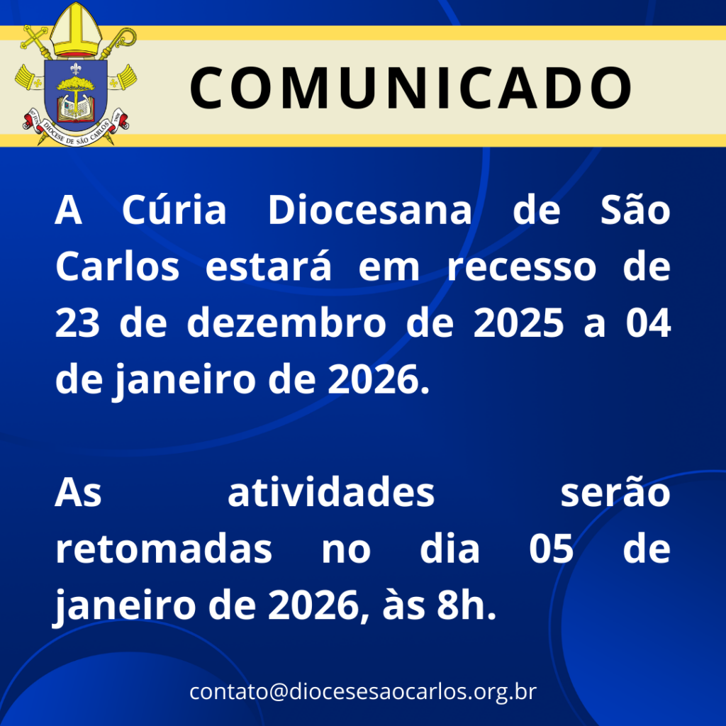 A Cúria Diocesana de São Carlos estará em recesso no período de 23 de dezembro de 2025 a 04 de janeiro de 2026. As atividades serão retomadas no dia 05 de janeiro, às 8h.