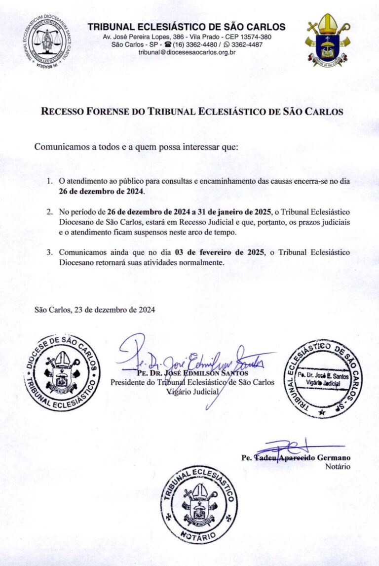 O Tribunal Eclesiástico da Diocese de São Carlos informa que estará em recesso forense no período de 26 de dezembro de 2024 a 31 de janeiro de 2025. As atividades do Tribunal serão retomadas no dia 3 de fevereiro de 2025.