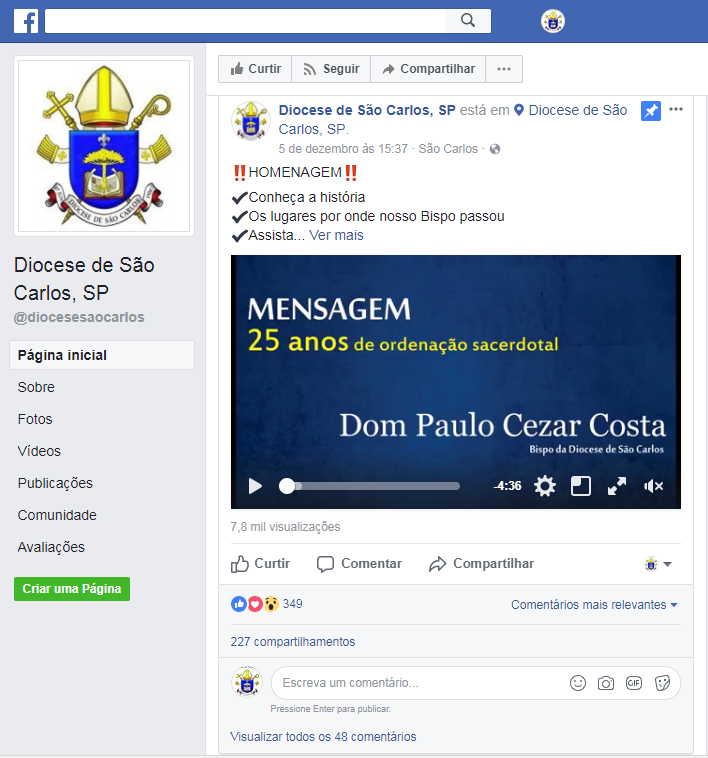 Com mais de 7 mil visualizações, mais de 349 curtidas, ultrapassando 227 compartilhamentos, diversas manifestações em comentários saudando o 7º bispo da centenária diocese de São Carlos, o vídeo já alcançou cerca de 29 mil 873 pessoas, que assistiram a história do bispo diocesano.