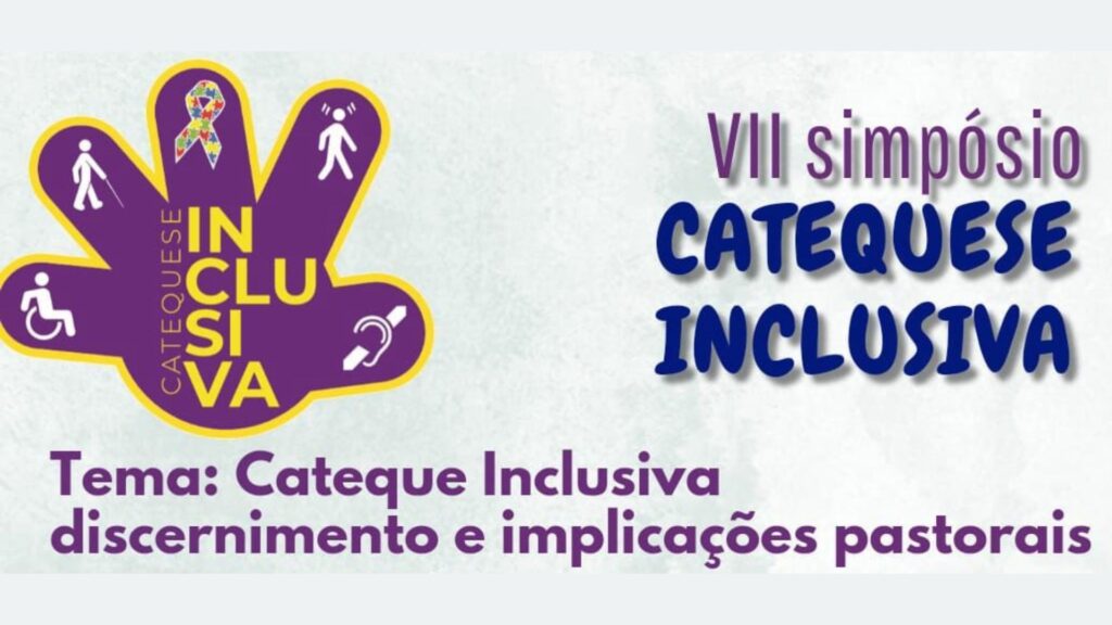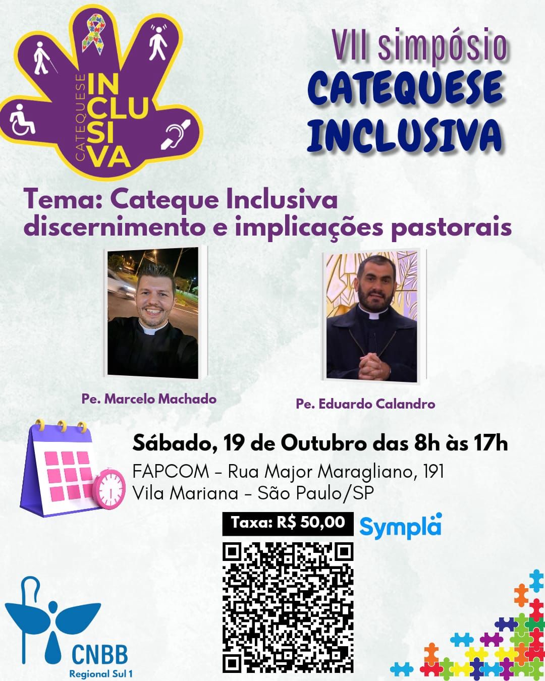 #paratodosverem. Banner informativo sobre VII Simpósio Catequese Inclusiva, que acontecerá no sábado, 19 de outubro, das 8h às 17h, na FAPCOM – Rua Major Maragliano, 191, Vila Mariana, São Paulo/SP. O tema do simpósio é “Catequese Inclusiva: discernimento e implicações pastorais”. Dois palestrantes estão listados: Pe. Marcelo Machado e Pe. Eduardo Calandro. A taxa de inscrição é de R$ 50,00 e o evento é organizado pelo CNBB Regional Sul 1. A imagem contém um símbolo da catequese inclusiva (uma mão na cor roxa e contorno amarelo, onde em cada dedo há um símbolo relacionado a uma deficiência -física, visual, TEA, intelectual e surdez -e na palma da mão escrito em fonte amarela em sentido vertical: “Catequese inclusiva”, sendo a palavra inclusiva com cada sílaba em uma linha), as fotos dos palestrantes, o QRcode para inscrição, o símbolo da CNBB e uma imagem de um quebra-cabeça colorido. Fim da descrição.